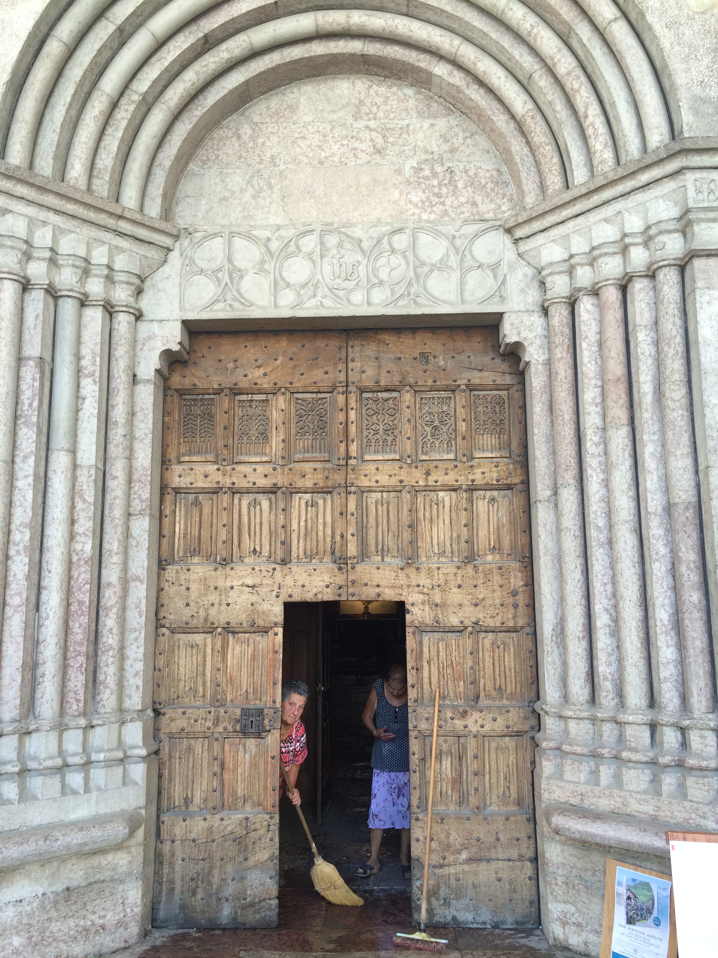 Keeping the front of the local church at Guillestre clean.