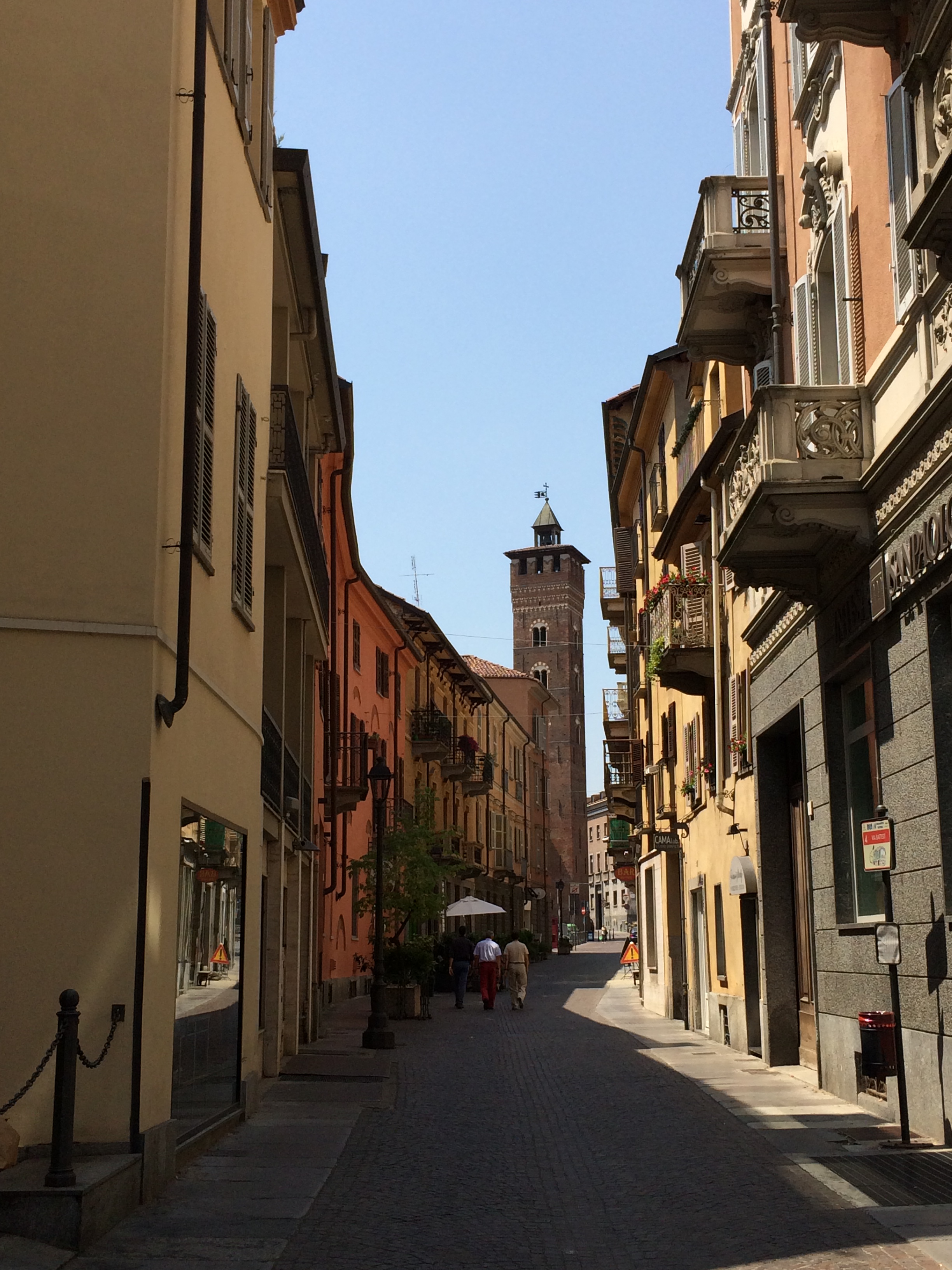 We walked to the edge of town until we found the restaurant.  Mercifully, it had air conditioning, which is surprisingly difficult to find. The homemade pasta was superb and Matteo the chef came out to greet us and explain that he was trying to keep alive the local cuisine of the region.  The wine too was a new experience – a white Lugana from the village of Desenzano (the next village along) which was was very pleasant indeed and matched our pasta dishes of ‘ravioloni with a chicken and rabbit filling’ and ‘tagliatelle al pomodoro’ perfectly.
