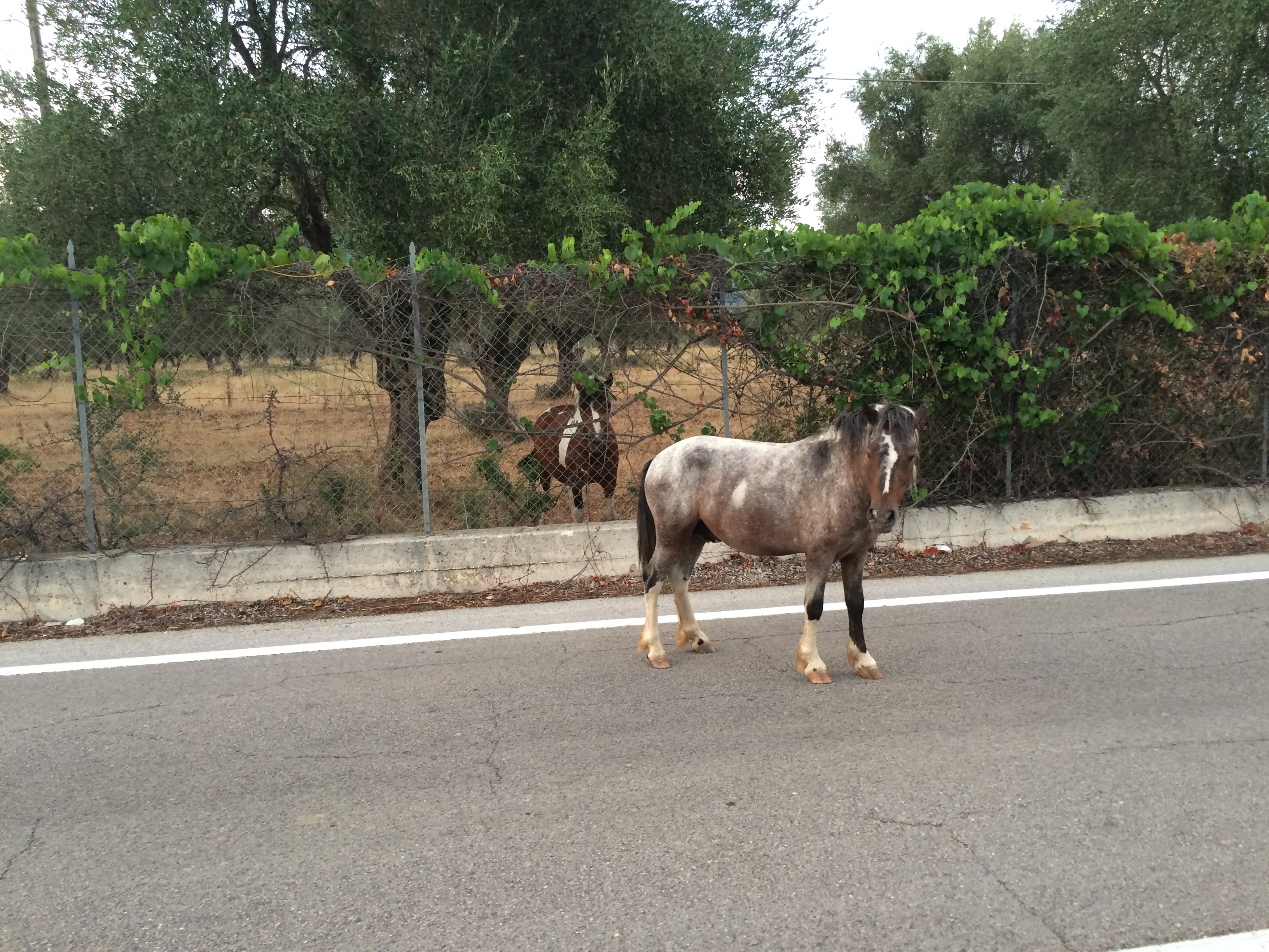 Disoriented-looking horse wandering on main road on its own as we approach Vieste.