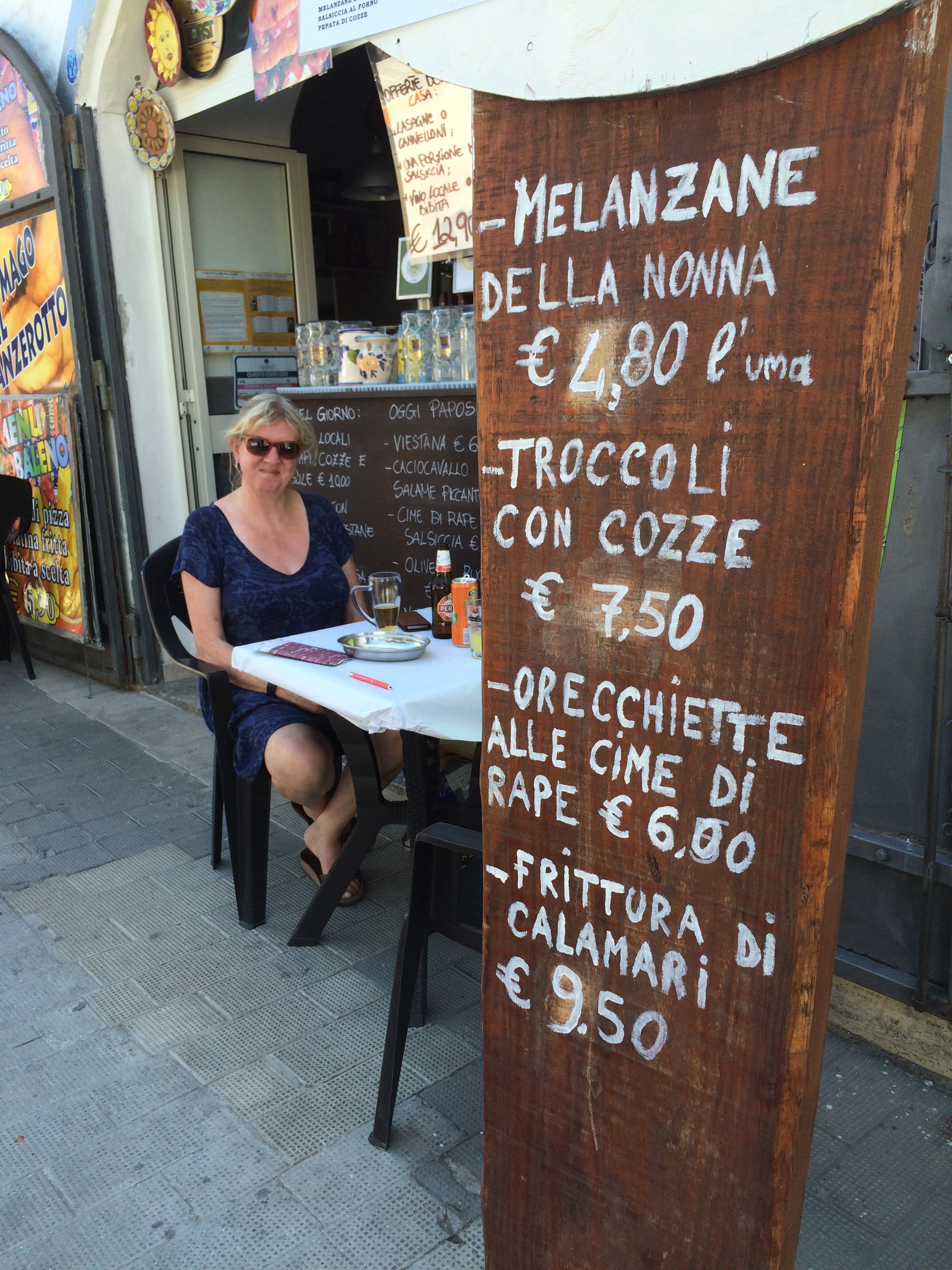 Our first evening was spent in one of the many harbour restaurants with Brenda safely parked, or so we thought, in the Cathedral car park.  Chatting to the waiters after a lovely supper of salcicie and Orechiette con frutta di mare, and ‘Tomaresca’ white wine made principally from the local Minervino Murge grape variety which was a very pleasant discovery for us, we were alarmed by their insistence that we move Brenda to a spot in front of the restaurant as she was not safe.  From what or whom no one would say but the exchange of knowing looks and nods and raised eyebrows were enough to convince us to move her to a spot ‘guaranteed’ by the restaurant would be OK as long as we paid a little something which they would pass to the night watchman! When in Trani, do as the Tranese do, vero o no?